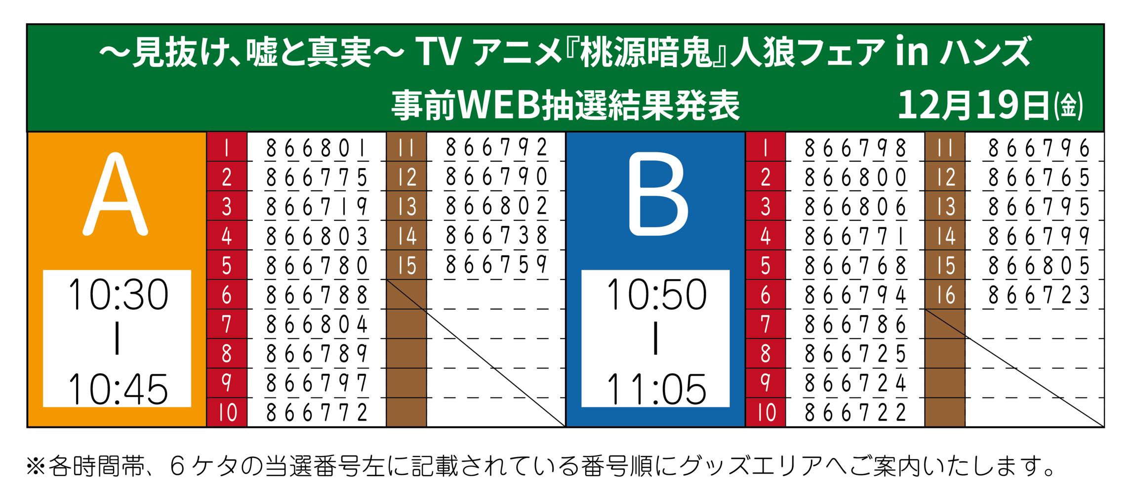 厳選なる抽選のうえ、時間帯および時間帯整列順を発表させていただきます。